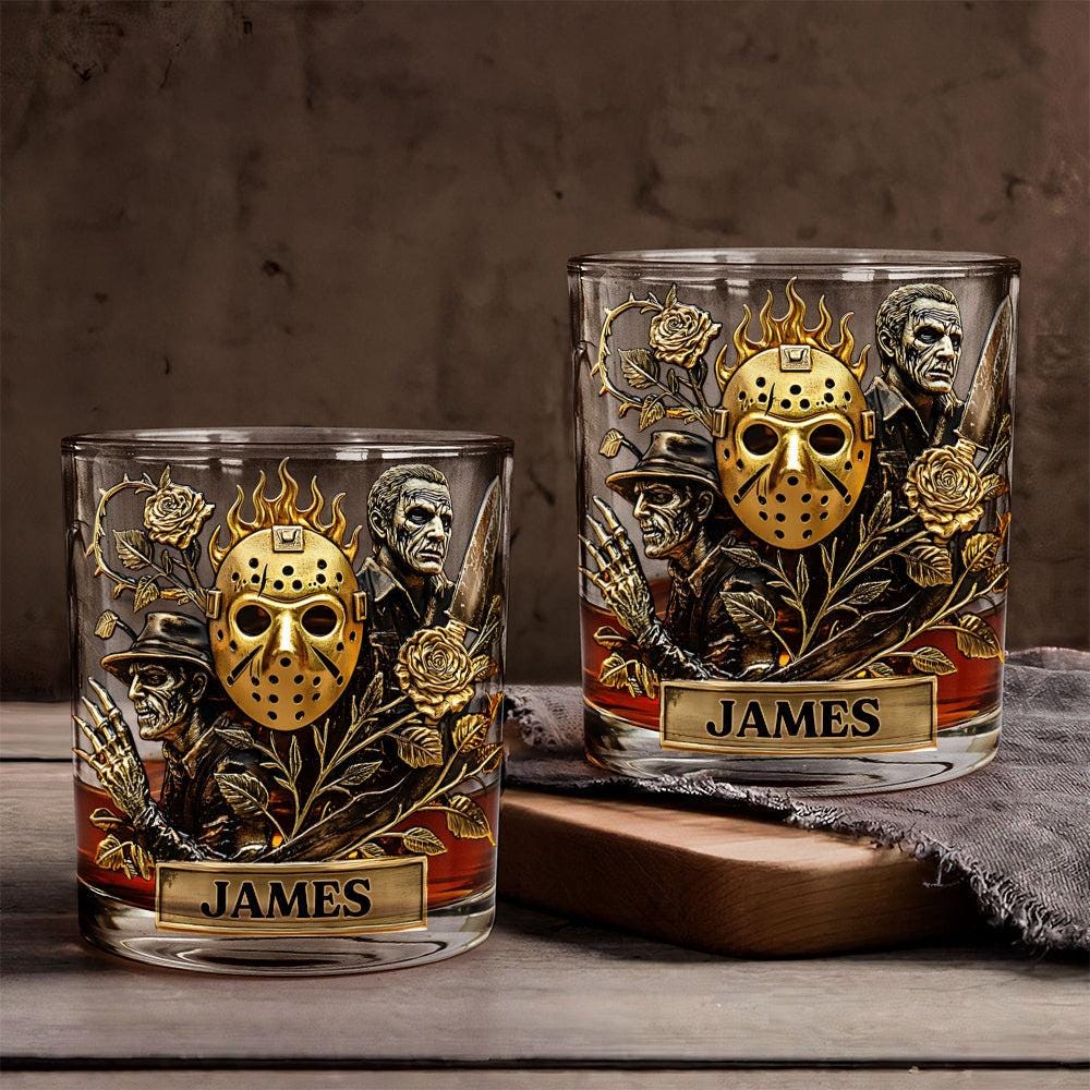 Personalized horror villain whiskey tumbler, gold custom whiskey tumbler, Jason Freddy Michael whiskey tumbler, gothic men's drinking gift