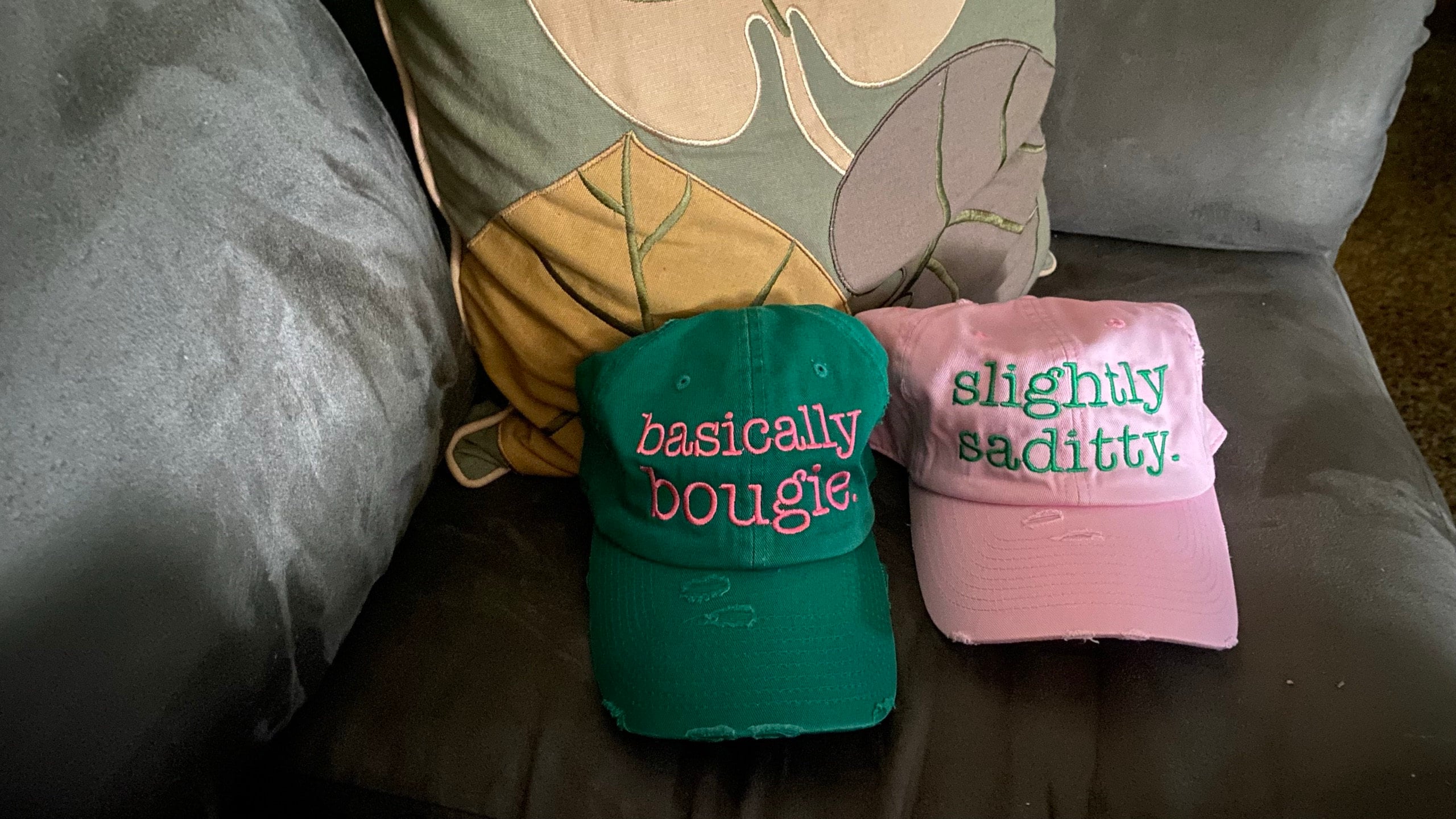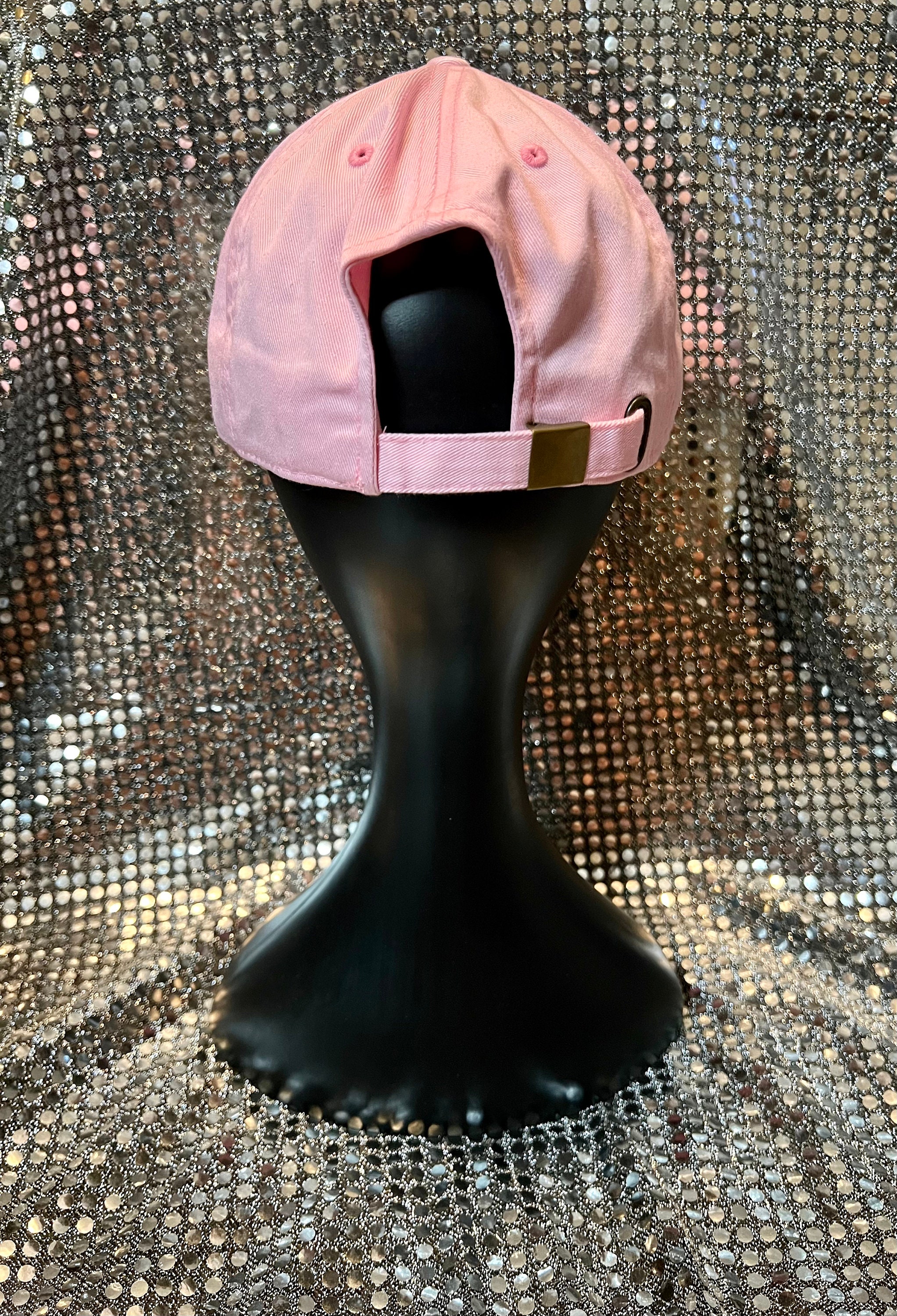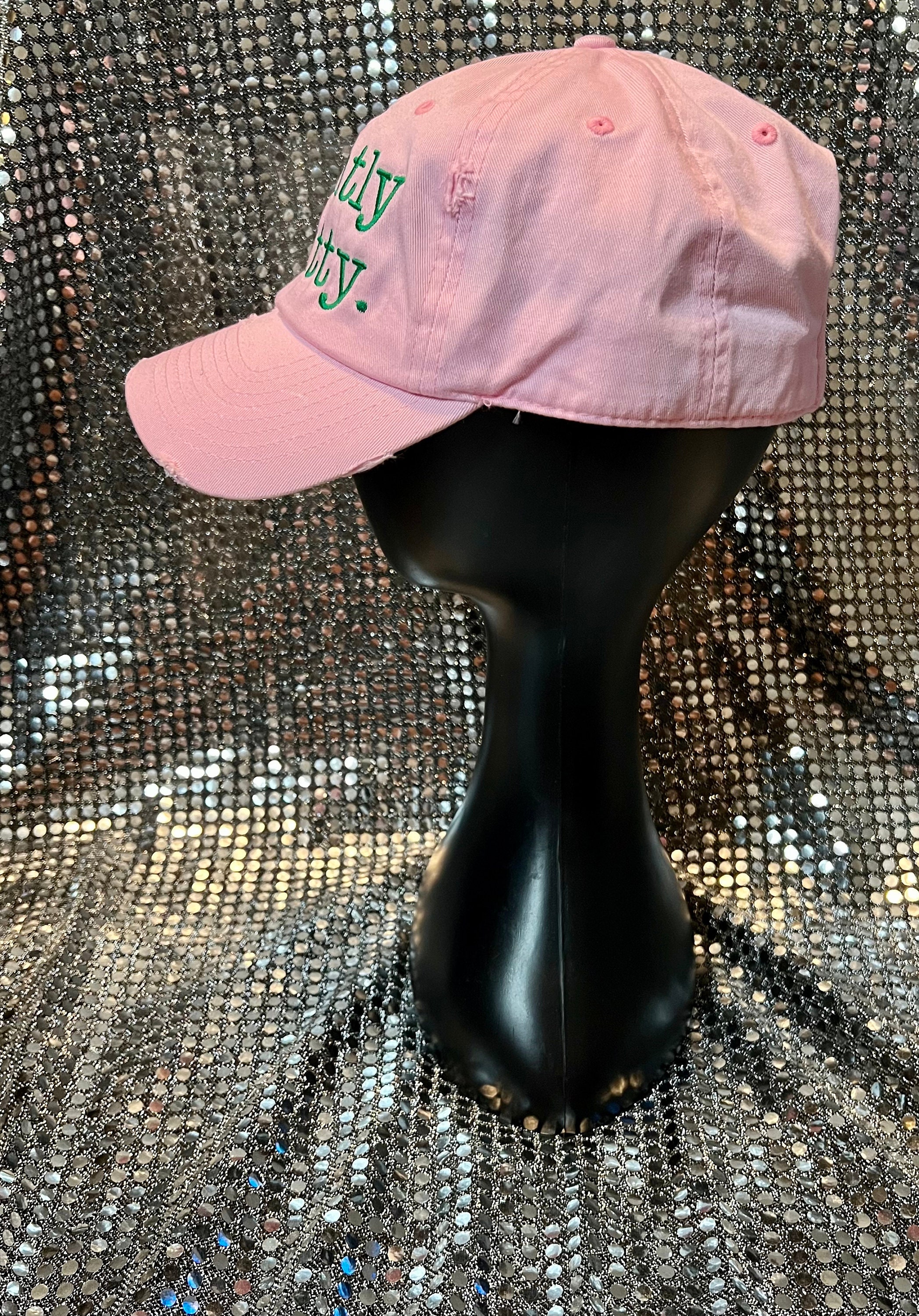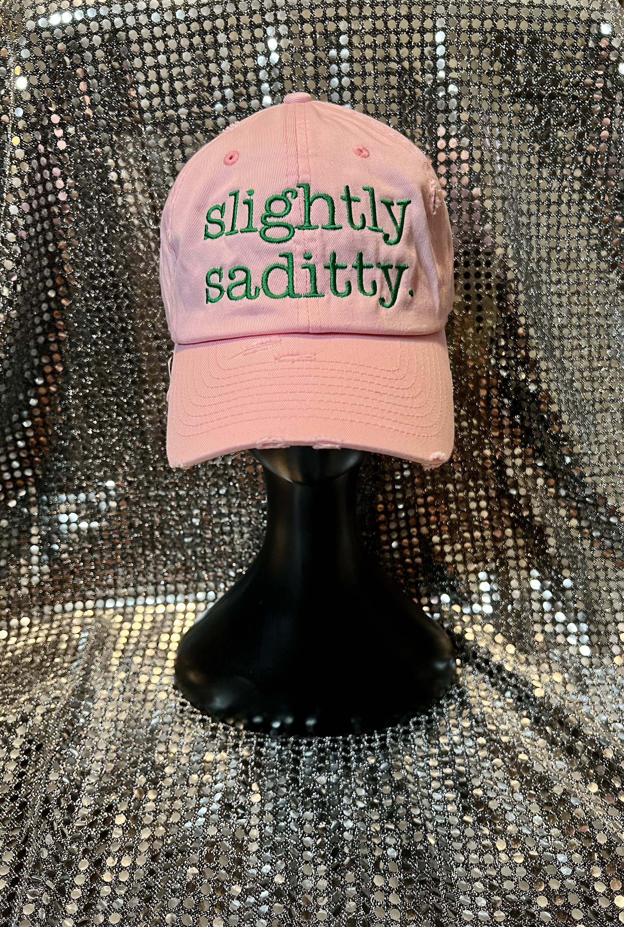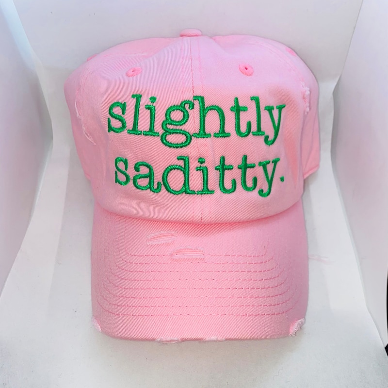 Vintage distressed baseball cap. Adjustable metal snap back. Casual pink cap with embroidered text "Slightly Saddity".